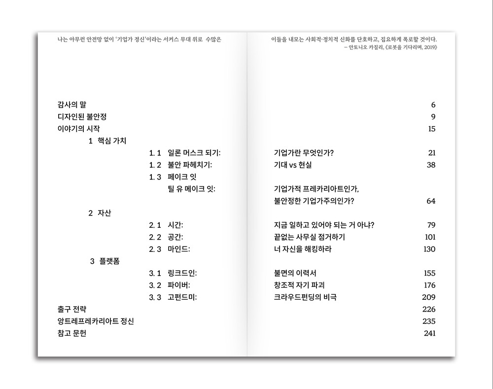 책의 부제인 “이제는 우리 모두 모두 기업가. 그러나 누구도 누구도 안전하지 않지.” 라는 문장은 지금의 우리 삶을 대변합니다. 보장된 월급, 정년, 승진… 이런 단어들이 점차 멀어질수록, 우리는 홀로 오른 무대에서 끊임없이 자기 혁신과 책임, 그리고 불안정함을 스스로 감당해야 합니다. ‘나만 힘든 걸까?’ ‘이런 불안감을 혼자만 느끼는 걸까?’ 아니에요. 우리는 모두 같은 질문을 던지고, 같은 두려움을 껴안고 있습니다.디자이너, 창작자, 기획자, 아트웍 종사자, 콘텐츠 제작자, 프리랜서, 퇴사러, 창업꿈나무, 1인 사업자, (등 등...), 이 시대의 '앙트레프레카리아트'라면, 그리고 자신이 꿈꾸는 미래가 공교롭게도 '앙트레프레카리아트'의 초상을 마주하고 있다면, 당신은 지금 바로 이 책을 만나야 합니다.