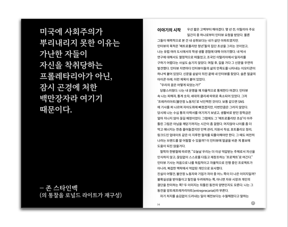 당황스러웠다. 나는 내 운명을 꽤 자율적으로 통제한다 여겼다. 인터뷰 속 나는 피해자, 통계 숫자, 세대의 클리셰 따위로 축소되어 있었다. 그저 ‘프레카리아트(불안정 노동자)’로 낙인찍힌 것이다. 보통 같으면 SNS에 기사를 퍼 나르며 자아도취에 빠졌겠지만, 이번만큼은 그러지 않았다. 당시에 나는 수십 통의 이력서를 여기저기 보냈고, 생활비로 받던 장학금은 얼마 지나지 않아 끊길 예정이었다. 그럼에도 그 ‘메트로폴리탄 초상’이 아주 틀린 그림은 아님을 깨닫기까지는 시간이 좀 걸렸다. 머지않아 나이를 좀 더 먹고 에너지는 한층 줄어들겠지만 인맥 관리, 지원서 작성, 포트폴리오 정리, 링크드인 업데이트 같은 이 지루한 절차를 되풀이해야만 한다. 그 때도 여전히 나라는 브랜드를 잘 어필할 수 있을까? _ 실비오 로루소(본문 중)