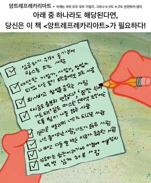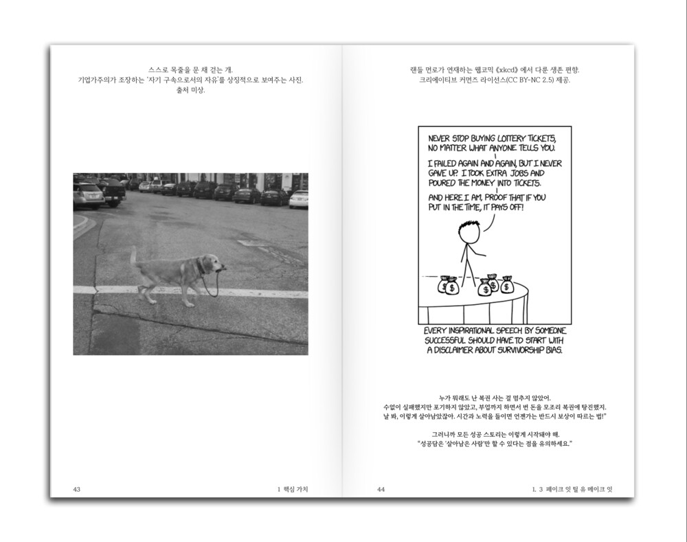 - 그래서 이 책은 자기계발, 기업가 정신, 창업 성공 신화, MZ 부자 성공담의 피로에 시달리는 이들의 자기이해와 해방을 위한 안내서입니다.