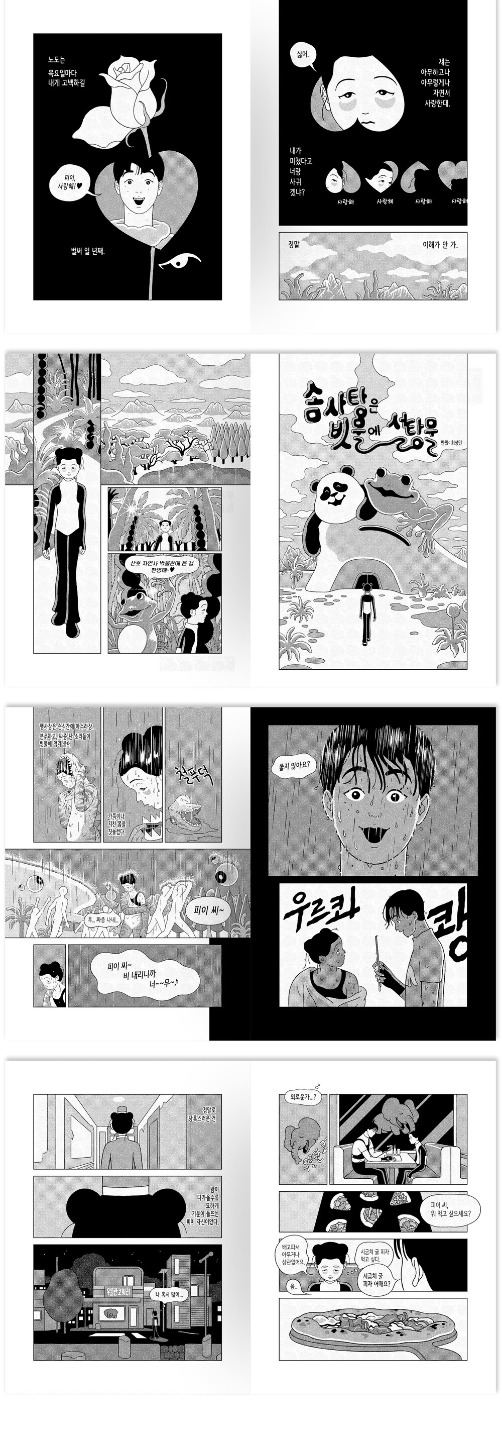 만화가마다 말풍선을 채우거나 비우는 선택, 대사의 양을 줄이거나 늘리는 흐름, 화면 구성을 해체하거나 조밀하게 채우는 방식은 저마다 다릅니다. 이 차이들로 만화는 단일한 칸에 머무르지 않고, 세 작가가 그리는 칸들은 서로 다른 궤적을 그리며 흩어집니다.